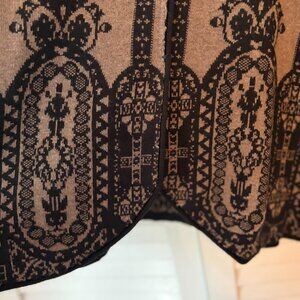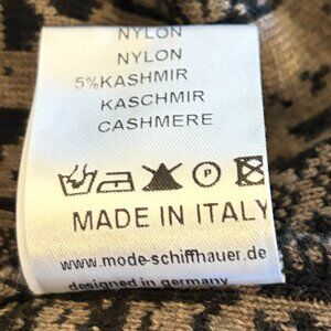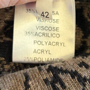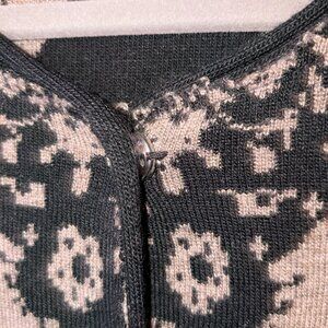 Shiffhauer Munich women's cardigan sweater, size 42. Tan with intricate black design. Crewneck. Long sleeves. Blended fabric with a little cashmere, very soft. Made in Italy. Gently worn, in excellent used condition. No rips or stains.