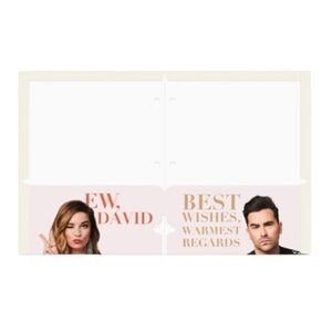 "The Schitt’s Creek Stationery Bundle, 3-Ring, 1" Binder, Notebook, Composition Book, and Folder has everything you need to start the school year off right. This awesome bundle includes a 1-inch vinyl binder, a 1-subject spiral notebook with 80 sheets of lined paper, a composition book with 100 sheets of lined paper, and a 2-pocket paper folder. Each piece is uniquely styled with designs inspired by the show Schitt’s Creek. All stationery is composed of FSC mixed certified paper. This bundle is designed for all ages."