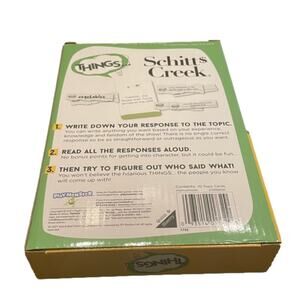 Schitt's Creek Edition Bebe Card Game 1616 Holdings Things Family Fun In Box. In this hilarious game, you read a topic card and then write down your response. It can be anything that comes to mind—there's no right or wrong answer! Then all the responses are read aloud, and you have to figure out who said what! You won't believe the THINGS… the people you know will come up with! New but is not in plastic.