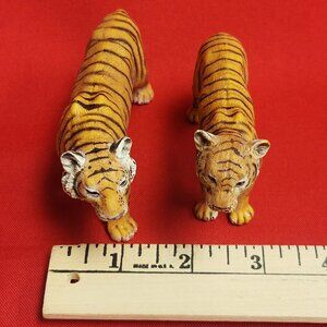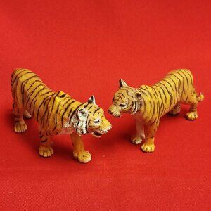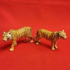 Figurines: Both are detailed, hand-painted models of tigers. The figurines are predominantly yellow-orange with black stripes and white facial and paw details. The figure on the left is slightly larger and positioned more towards the viewer. The figure on the right is slightly smaller, possibly a cub, and stands next to the first one.