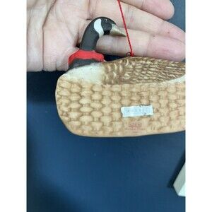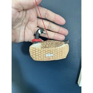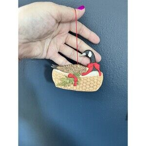 Vintage 1983 porcelain Schmid Canadian Goose wearing a red ribbon bow and resting in a basket. It has a red thin hanging string. It is in excellent preowned condition, and comes from a smoke free but pet friendly home. It measures 3.25 inches in width by 2.75 inches in length. Please look over all pictures carefully before purchasing. I ship within 24 to 48 hours after receipt of payment. Measurements are approximate.