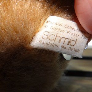 This listing is for a Schmid Gordon Fraser Musical Jointed Teddy Bear. 1983. Works great. 14" tall. Shows minimal wear. There may possibly be a tiny patch of hair that has been cut on the left paw. Not noticeable but did want to mention! Great shape for its age. No clothing. Bear only. Please see all pics and feel free to ask questions! :)