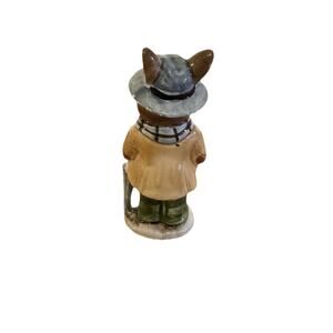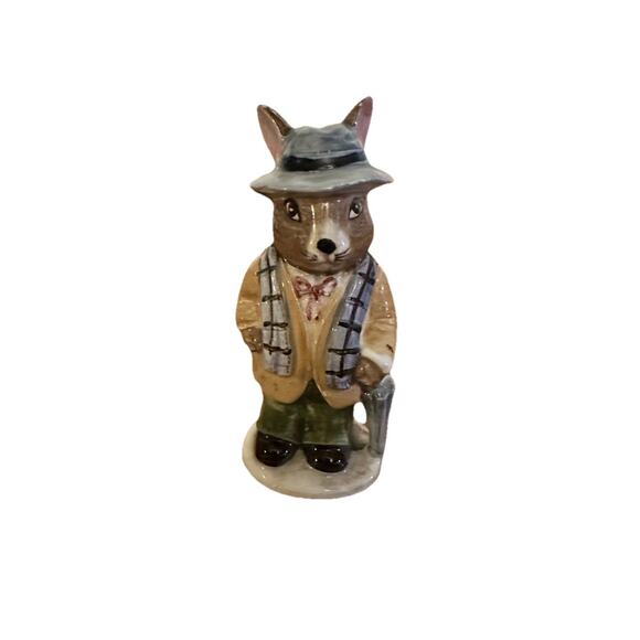Add a touch of vintage charm to your collection with this adorable 1982 Schmid “Rodney the Rabbit” figurine. Handcrafted and handpainted in Japan, Rodney is dressed in a tan jacket with plaid vest, green trousers, bow tie, and a stylish grey fedora, holding an umbrella at his side.