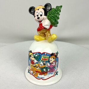 This vintage Mickey Mouse Bell is perfect for any Disney collector. This porcelain bell's handle features Mickey holding a Christmas tree. While the body of the bell features a scene with of Minnie, Mickey, and Pluto at the Christmas Tree lot.