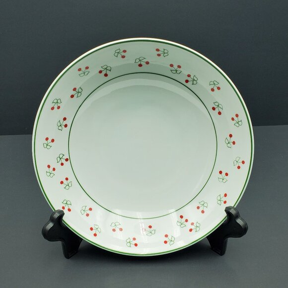 Schmidt Porcelana Brasil Cherries Serving Bowl. White porcelain vegetable serving bowl with cherries and green bands. 9.75" x 2-3/8".