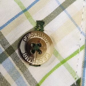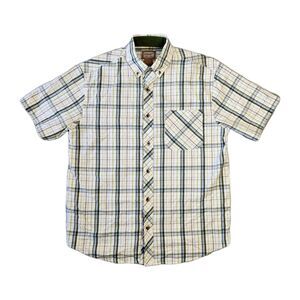Schmidt Shirt Men's Size L ( Large ) White With Multicolor Plaid Button Down One Chest Pocket Spell Out Button Workwear Chore Utility Wear To Work Menswear Shirtwear Outdoors Rugged Tartan Buffalo Plaid Over The Road Asphalt Cowboy Church Holiday Trucker Style.