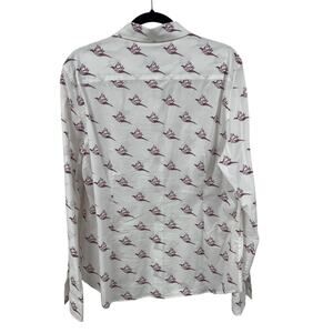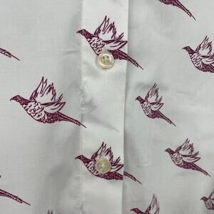 • Features: Long sleeve, Button up, Collared, Buttons at cuffs, White with fig colored pheasant birds printed all over, Cotton blend