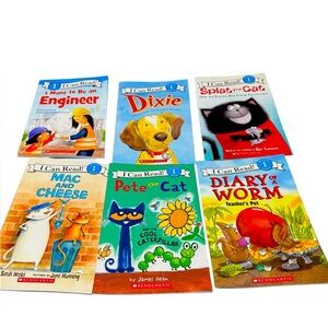 Scholastic- I Can Read 6 Book Bundle. Beginning 1 Reading. Includes I Want To Be An Engineer, Dixie, Splat The Cat, Mac & Cheese, Pete The Cat & The Cool Caterpillar, & Diary of A Worm: Teachers Pet