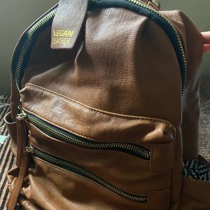 Brownish school leather Backpack with lots of pockets all over. it’s so cute I love the texture! Used but in good condition just couple flaws but it’s hard to know/tell/see