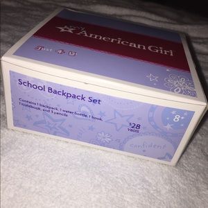 American Girl school backpack set, includes: 1 backpack, 1 water bottle, 1 book, 1 notebook, and 3 pencils