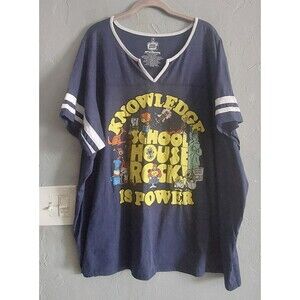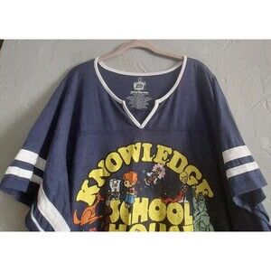 Fun and retro School House Rock! pullover top in a classic varsity style. Made from a soft cotton and polyester blend, featuring short sleeves with sporty white stripes and a v-notch neckline. The front graphic reads Knowledge is Power with colorful School House Rock characters.