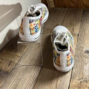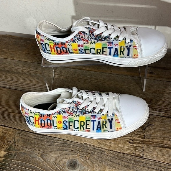 School secretary gym shoes/sneakers. Unisex male size 5 female size 7. No rips or tears. EUC.