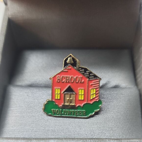 Charming enamel pin featuring a schoolhouse design. Perfect for volunteers. some tarnish at backing Inventory Location Box 56