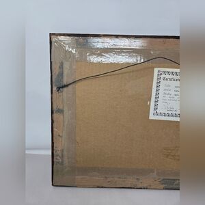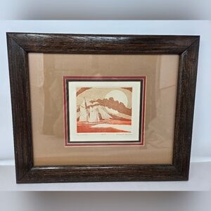 This original etching by Robert Paul, titled "Schooner," depicts a boat out on the ocean. The artwork is signed by the artist and framed in a wood frame. The etching is made with ink, paper, and pencil and is a medium-sized piece. It is a contemporary piece from the period of 1970-1979 and is a realistic style. The artwork is a licensed reproduction and comes with a certificate of authenticity (COA) issued by Hang Ups.
