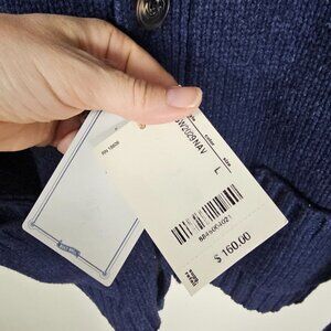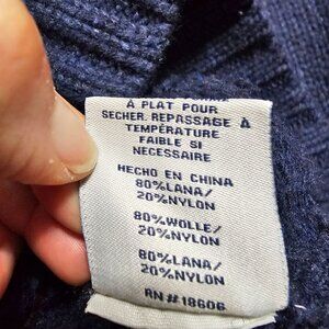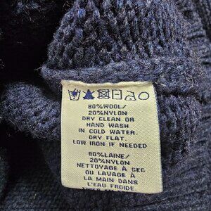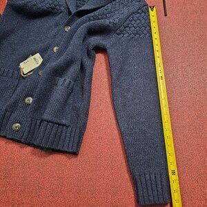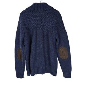 This navy cardigan sweater features a classic shawl collar and corduroy elbow patches. Made from a blend of wool and nylon, it offers warmth and style.