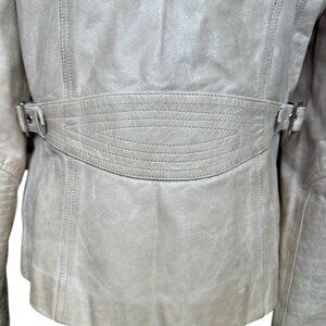 The jacket features two zipped pockets on the front and the interior lining is clean and intact. The back of the jacket has a unique design leading to cinched side buckles. The back side of each sleeve has a stitched pattern that matches the front of the jacket. Overall this jacket presents beautifully and would be a stylish addition to any wardrobe!
