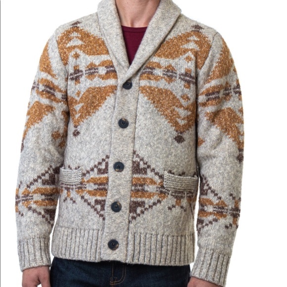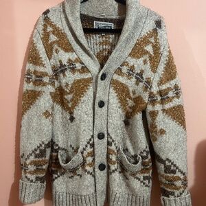“Appreciate the warmth of this thick, mixed-stitch ‘Prescott’ cardigan sweater with a Southwestern pattern, shawl collar, rib trim and button front. Cotton/polyester/yak. Hand wash. Imported. Sizes S (34 to 36)”