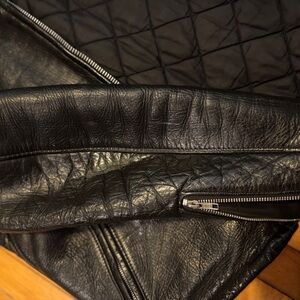 Schott vintage 601HH Café Racer in horsehide leather. I’ve had this jacket for about 35 years, cleaning and conditioning regularly it with Lexol. It’s tagged 46 but please see my actual measurements in photos to ensure an accurate fit. There are no returns. The leather and interior are in very good condition with the main and pocket zippers functioning nicely. Left sleeve zipper needs repair or replacement and there is an abrasion (not hole) about the size of a dime just above it (See photos).