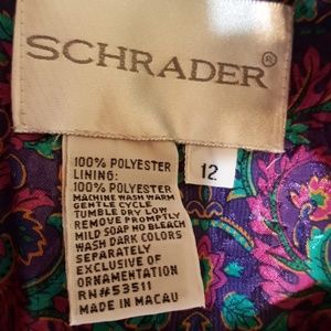 This is a beautiful vintage work of art by Schrader. It has such a pretty pattern and complimentary colors! It feels silky soft, it has lovely ornamental fabric covered buttons down the front, and it zips in the back. It looks like a tunic with side slits over a pleated skirt, but it's all one piece. No holes, no stains, no pilling, no pulls, no flaws at all. See pics 6 & 7 for approx measurements and pic 8 for tag with size and fabric content. Size 12.