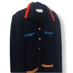 This Schrader Sport vintage button-down shirt in size small brings a bold retro flair. The shirt features a black base with colorful accents in red, blue, and orange, paired with gold-tone buttons for a standout look. Tailored with a structured fit, it’s perfect for vintage collectors or statement styling.