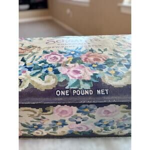 This vintage tin from features Schrafft's Chocolates, a beloved candy brand from the 1940s. The tin is adorned with a vibrant, multi-color needlepoint design and holds one pound of candy. It is a perfect addition to any collection of advertising merchandise or nostalgic memorabilia. . Bring a piece of New York and Boston culture into your home with this charming tin.The background is a rich royal purple (not sure if one can tell from the photos). It is a well made box, as the lid alone is one-half inches thick, something you will not find in today's products. Hinges are study. Box is 8 inches long, 4.75 inches wide and 2.5 inches tall. It is beautiful.