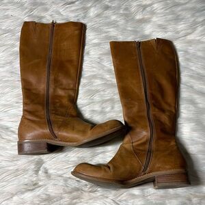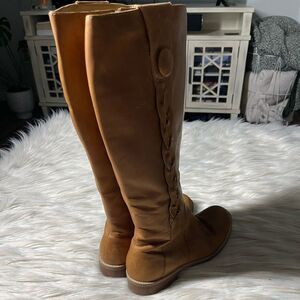 Leather Boots by Schuler & Sons Philadelphia in Tan. Inner zip closure. Round toe. Heeled. Woven lattice detail at sides. Gently worn with some small flaws- decorative button missing at one side, some wear at inside rim of boot, and some marks in leather/heel (all pictured). Measurements in photos. Size 8B.