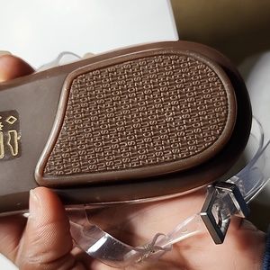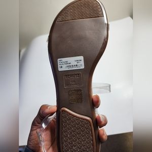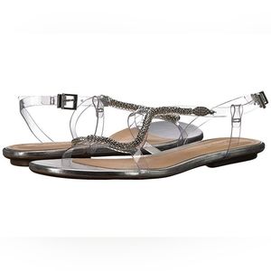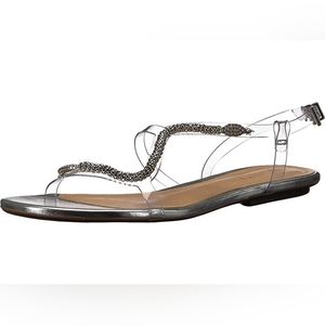 Barely there, illusion strappy sandal for the ultimate minimalist look. Crafted from vinyl and featuring an adjustable ankle strap plus metallic hardware and rhinestone embellishment.