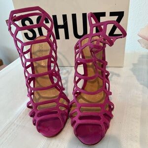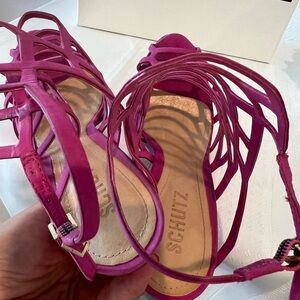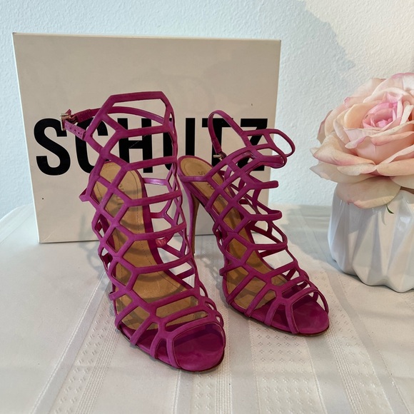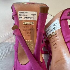 Hot pink or pink sexy sandals beautiful heels, suede great condition you can't even see foot sweat on the leather worn a few times that's all. Comes in a box