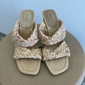 Schultz Women’s Amani Straw Beige Tan Block Heel Slip On Sandal