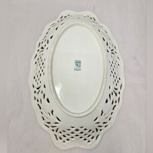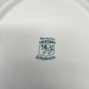 The dish has perforated edges and is decorated with Victorian style. It is a unique piece of art pottery from the 1850-1899 period and is handmade with a printed backstamp. This original Schumann Bavaria dish is perfect for collectors and lovers of vintage decor.