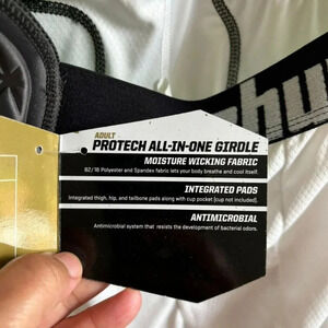 Stay protected and comfortable! Schutt Men’s Protech All-in-One Girdle in White, Size Large. Ideal for high-impact sports and full mobility. #SchuttSports #ProtectiveGear #AthleticEssentials