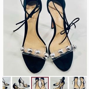 A stunning black stiletto heel, leather sole with translucent straps across the toes. Never-worn and with dust bag/box.