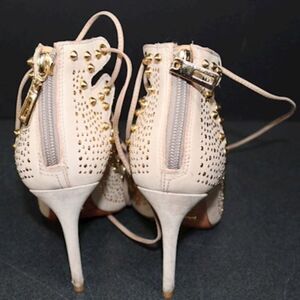 This is a gorgeous pair of Schutz Arieli lace up pumps, beige in size 6 B. Faceted accents and polished studs put a sexy twist on a pair of lace-up booties from Schutz. Exposed back zip and covered 4” stiletto heel. Leather sole booties are in good shape, gently used with heaviest signs of use on the soles.