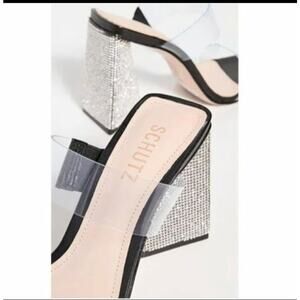 These eye-catching heels feature an angular crystal-encrusted heel. They are a mule style with black accenting the crystals. They have vinyl transparent straps that add to the illusion of the design. It is an open-toe leather sole with a rubber heel cap. There are just a couple rhinestones missing but so minimal you cannot notice without thorough inspection. I also included a photo were there is a little knick on the upper of the foot bed. New without box, tags have been removed as shown in the photos.