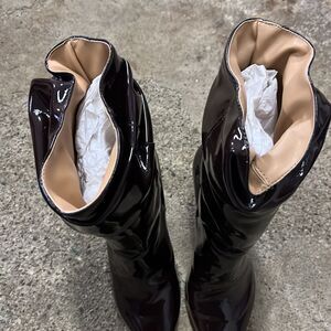 Materials: patent leather (espresso) Upper format: Slouch Rubber patch at the heel. Heel Type: High Heel Heel Style: Stiletto Closure Type: Slip-on Toe Style: Pointed toe Counter Type: Closed Shaft Circumference: 14.44in | 361mm Shaft Height: 8in | 200mm Heel Height: 3.5in | 89mm