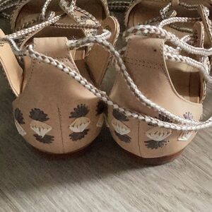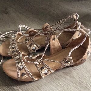 Stylish beige sandals featuring intricate rope detailing. Perfect for casual outings.