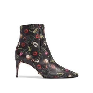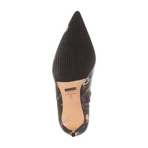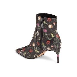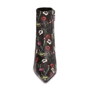 Adorable floral print allover black pointed toe bootie and mid-height svelte heel.