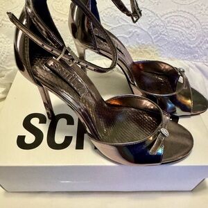 Step into sophistication with these Schutz black high heel sandals, featuring a sleek stiletto heel and a chic ankle strap. Perfect for formal occasions, their minimalist design ensures a timeless elegance.