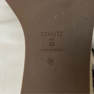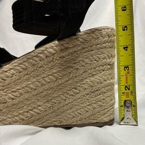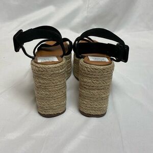 Schutz Blisse Nubuck Sandal features a platform, braided rope sole, square toe, buckled strap and a leather upper. New without box. Please see pictures for more details and heel height.