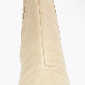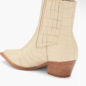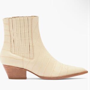 A modern cowboy boot is updated in a croc embossed leather construction, cushioned with arch support and lifted by a stacked sole.