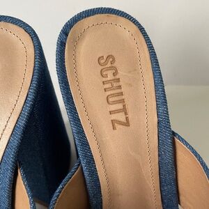 Schutz Callie Denim Block Heel Mules Blue Crossover Sandals Women’s Size 6 NWOB