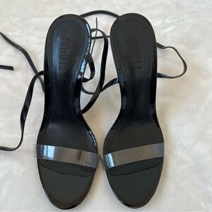 Schultz Cloe Vinyl heels. Size 9.5. EUC. Shiny black straps. Clear across the toes. Very versatile and pair well with many different outfits!