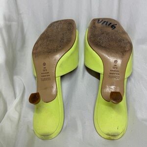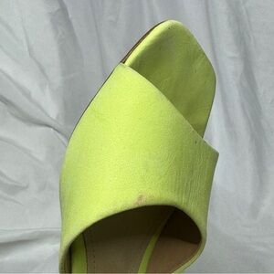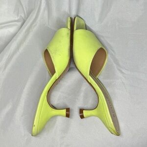 2” kitten heel, open toe, leather sole, slide, vibrant lime green in “green fresh”, Palm Springs style, retro, tennis and pickleball inspired, semi formal, tropical, vacation