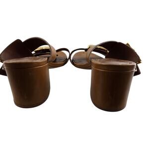 Schutz Enola Mid Block Sandals Womens 8.5 Caramel Brown Leather Gold Tone Buckle