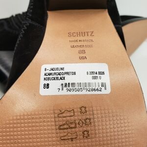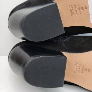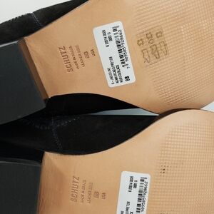 Step out in style with these Schutz Cowgirl boots in size 8B. These black suede boots feature a pointed toe and pull-on closure for easy wear. The side stretch panel and cushioned insole provide added comfort, making them perfect for travel, parties, or casual wear. The block heel measures mid-height, at 2-2.9 inches, while the outsole is made of leather for durability and slip resistance.