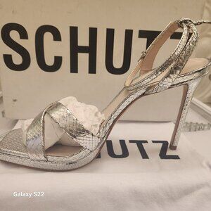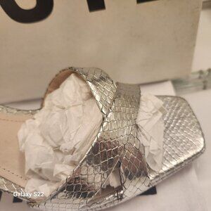 Schutz Leather "Ava Rose Heels" Metallic Snake Smash. NIB (not price tag). Size Various. Pics are of the 9.5 but I have a size 9 also in the same condition/box. No rips/stains or tears. One shoe has some tag residue on base (no rips). Original box/packaging. Comes with dust bag. Box has some dirt markings, but in great condition. Wrap around ankle with adjustable straps for fit. Heel height: 4.65 inches. Smoke free home. No odors. All offers are welcome. Thank you!