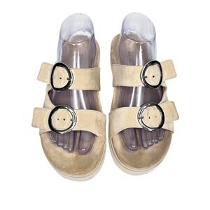 Schutz Light Tan Suede Double Buckle Flat Slip On Contoured Foodbed Sandals