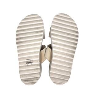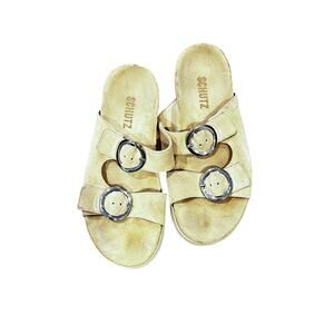 Schutz Light Tan Suede Double Buckle Flat Slip On Sandals. White rubber soles are a little scuffed. Suede has some markings but overall in very good condition. Adjustable straps. Cushioned footbed. Size 8B.