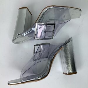 Schutz Madaleni Slide Vinyl Square Toe Block Heel Silver Sandal Women Sz 8.5B