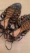 Step out in style with these chic black and gold strappy sandals. Perfect for any occasion, these shoes offer both comfort and elegance. Gladiator sandal with embellishment. 1 inch heel. Adjustable laces. Leather insole. Leather outsole. Upper: leather. Color: black